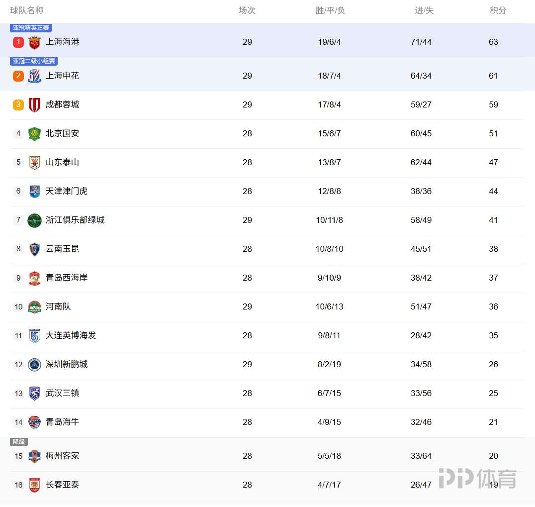 中超積分榜:海港剩1輪領(lǐng)先申花2分,蓉城輸球僅剩亞冠席位可爭