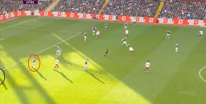 所以在第28分鐘,阿斯頓維拉完成搶斷之后,發(fā)動了左路的進(jìn)攻,一腳傳中打到禁區(qū)內(nèi),便來到了后點的卡什腳下: