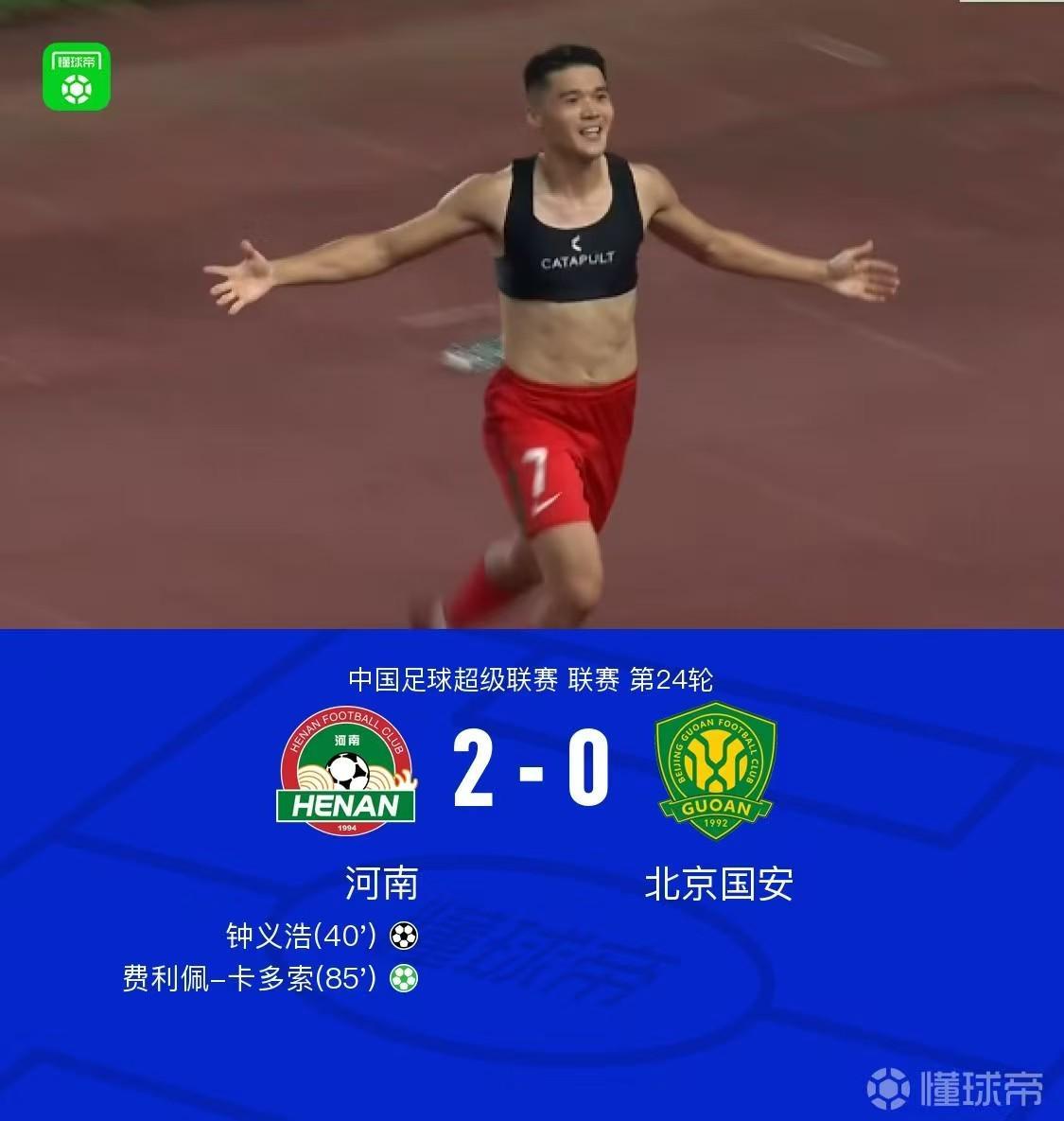 聯(lián)賽第24輪,河南隊移師航海2-0力克國安,鐘義浩在自己的百場里程碑完成破門,下半場國安后衛(wèi)柏楊送點,卡多索點射鎖定勝局。北京國安在0-6慘敗山東泰山后不敵河南遭遇兩連敗。